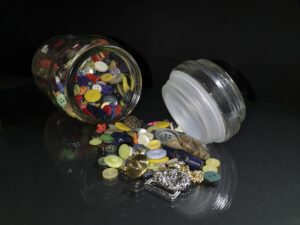 Ouderwetse pot met kleurige knopen welke een nostalgisch gevoel oproepen.